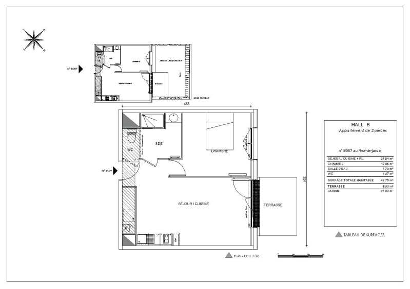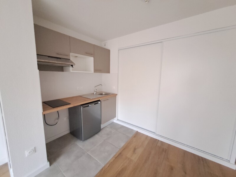 Il est composé d'un WC , d'une salle d'eau, d'un séjour avec cuisine aménagée (évier inox, plaque 2 feux, hotte, meubles hauts et bas, frigo top) donnant sur une terrasse de 6m² avec son jardin de 21m².