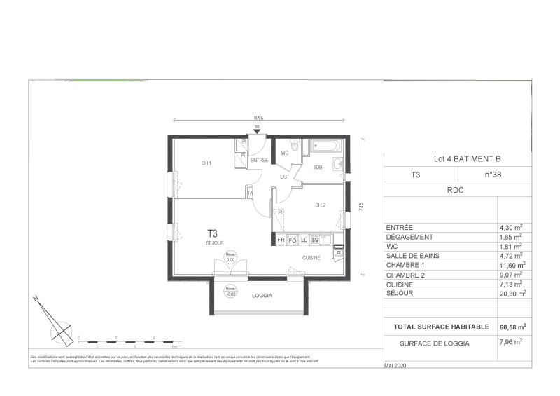 Nous vous proposons un agréable T3 composé d'une entrée, d'un séjour avec cuisine aménagée (évier inox, plaque 4 feux, hotte, meubles hauts et bas, four), de deux chambres avec placards, d'une salle de bains aménagée et d'un WC séparé et d'une loggia de 7.96m². Il bénéficie d'un parking aérien.