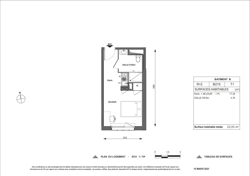 Il est composé d'une entrée, d'une pièce à vivre avec cuisine aménagée (évier inox, plaque 2 feux, hotte, meubles hauts et bas, réfrigérateur table top), d'une salle d'eau aménagée avec WC . Il bénéficie d'un parking sous-sol.