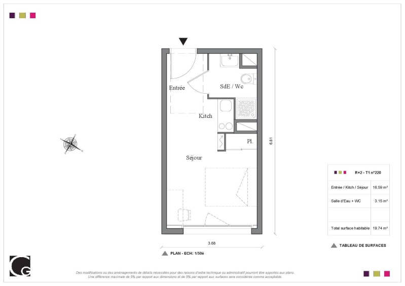 Il est composé d'un séjour avec cuisine équipée (évier inox, plaque 2 feux, hotte, meubles hauts et bas, frigo top), d'une salle d'eau aménagée avec WC, un parking aérien est dédié au logement.