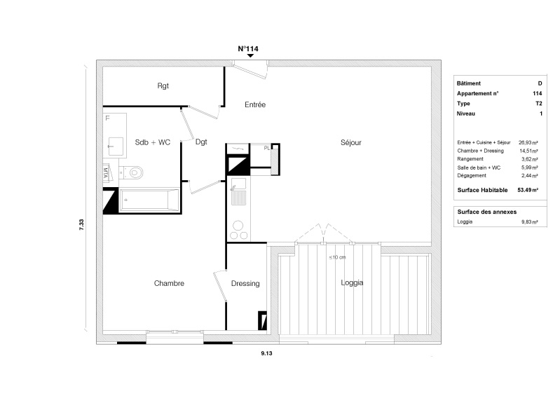 L'appartement s'ouvre sur une entrée menant à un séjour lumineux avec coin cuisine , prolongé par une spacieuse loggia de 9,83 m², idéale pour profiter d'un véritable espace de vie supplémentaire.
