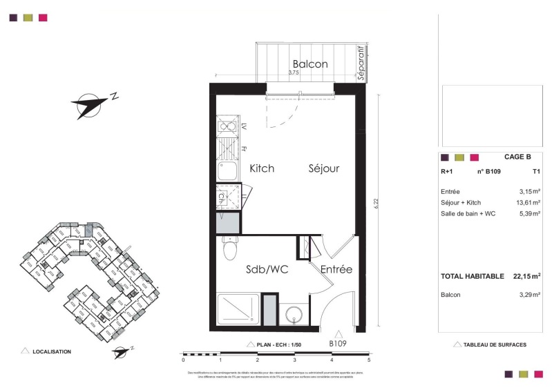 Il est composé d'une entrée, d'un séjour avec cuisine équipée (évier inox, plaque 2 feux, hotte, meubles hauts et bas, frigo top), d'une salle d'eau aménagée avec WC, d'un balcon de 3.29m². Il bénéficie d'un parking aérien.