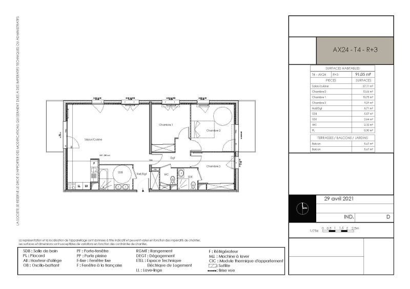 Il est composé d'une entrée, d'un séjour lumineux avec cuisine équipée (évier inox - meubles hauts et bas - hotte - plaques vitrocéramiques 4 feux) donnant sur un balcon de 5.67m², d'une salle de bains , d'un WC séparé ,de trois chambres dont une avec placard et une avec accès sur le deuxième balcon de 5.67m² et d'une salle d'eau avec WC .