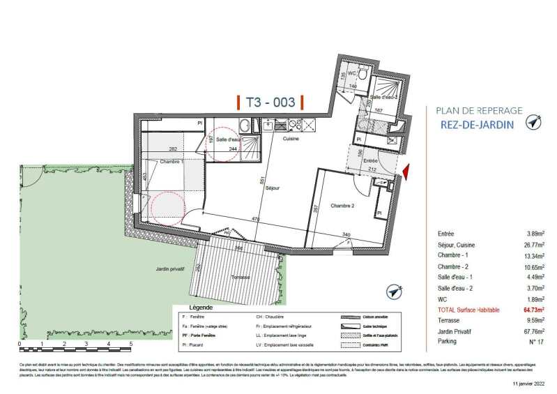 Il est composé d'une entrée, d'un séjour avec cuisine équipée (évier, meubles haut et bas, plaque de cuisson vitrocéramique 3 feux, hotte) , de deux chambres avec placard dont une avec salle d'eau, d'une salle d'eau aménagée, d'un WC séparé et d'une terrase de 9,59m² et son jardin privatif de 67.76m². Il bénéficie d'un parking en sous-sol.