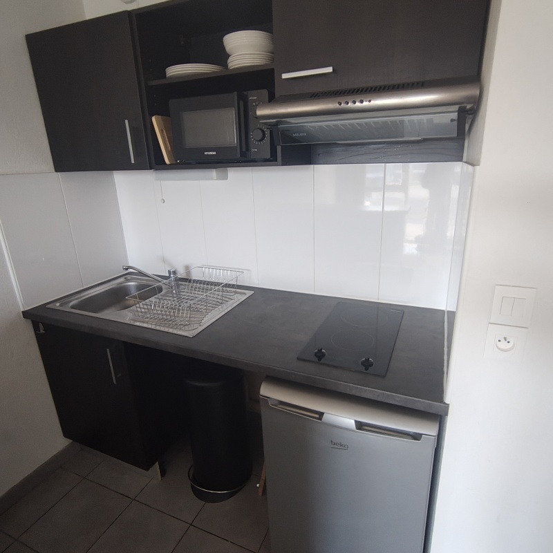 LEURappartement bénéficie dEURune entrée indépendante menant à une cuisine aménagée (meubles hauts et bas), équipée dEURune plaque 2 feux, dEURune hotte, dEURun four micro-ondes, avec un comptoir astucieux séparant la cuisine de lEURespace de vie tout en offrant du rangement.