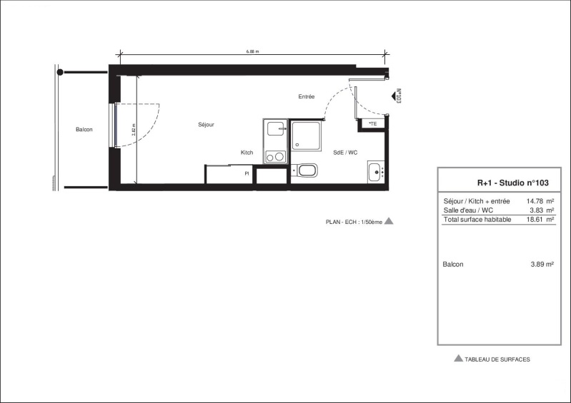 Il est composé d'une entrée, d'une pièce de vie avec cuisine équipée (évier inox, plaque 2 feux, hotte, meubles hauts et bas,frigo table top), d'une salle d'eau aménagée avec WC, d'un balcon de 3.89m².