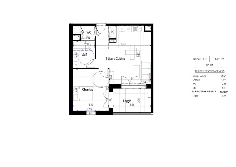 L'appartement se compose d'un séjour lumineux avec une cuisine s'ouvrant sur une loggia de 8.30m², d'une chambre, d'une salle de bain aménagée et WC séparé.