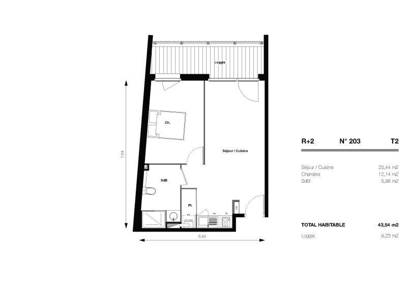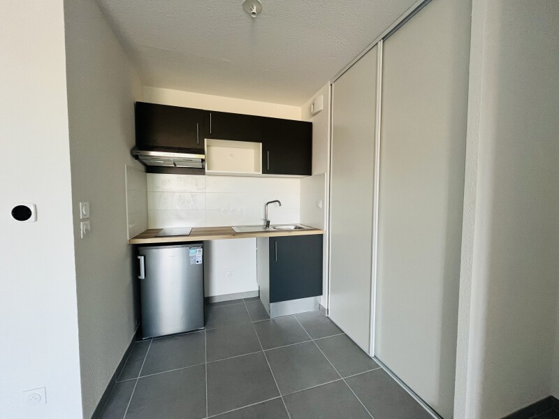 Il est composé d'un séjour avec cuisine équipée (Meubles hauts et bas, un évier, plaque 2 feux, une hotte, réfrigérateur table top, un placard), s'ouvrant sur une loggia de 9.23m², d'une chambre, d'une salle d'eau aménagée avec un WC. Il bénéficie de deux places de parking extérieures.