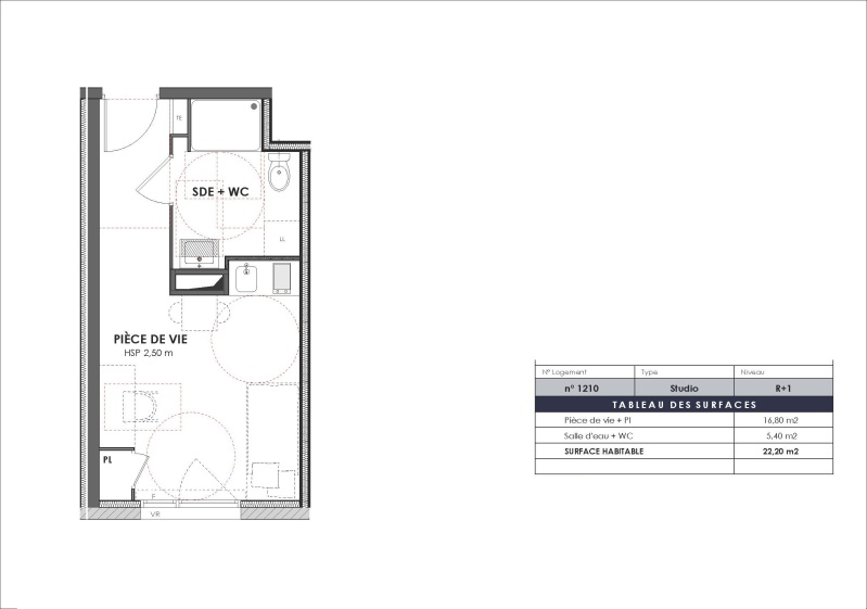 Ce studio de 22.20 m² offre une pièce de vie fonctionnelle avec une cuisine équipée, un réfrigérateur table top et des rangements pratiques. La salle d'eau moderne avec WC vous garantit un confort simple et efficace au quotidien.