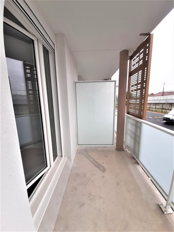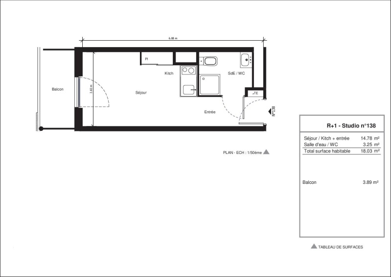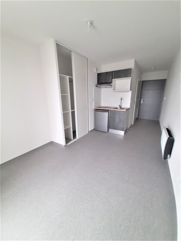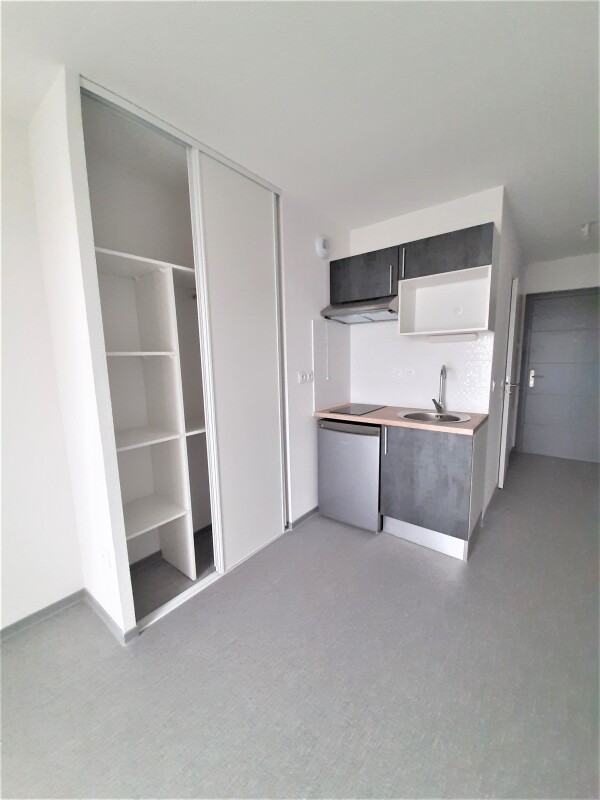 Il est composé d'une entrée, d'une pièce de vie avec cuisine équipée (évier inox, plaque 2 feux, hotte, meubles hauts et bas,frigo table top), d'une salle d'eau aménagée avec WC, d'un balcon de 3.89m². Il bénéficie d'une place de parking extérieure.