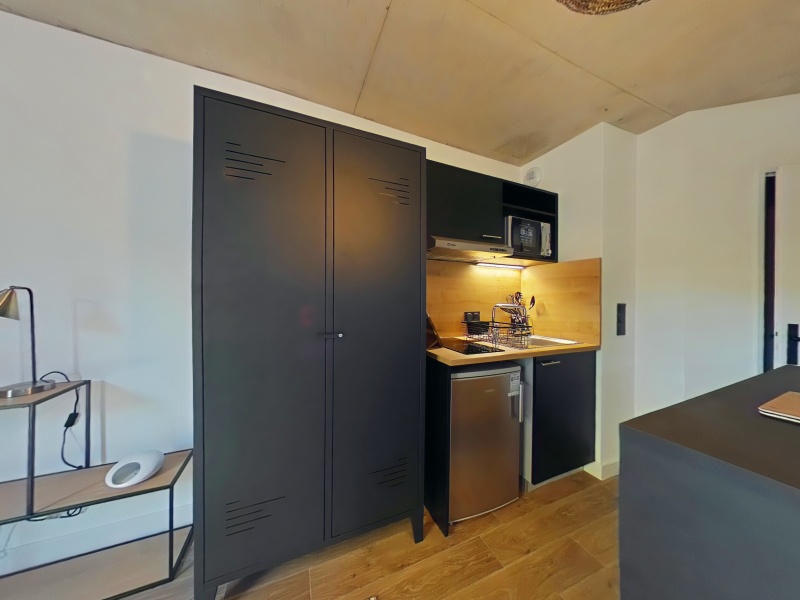 Nous vous invitons à venir découvrir cet agréable studio meublé composé d'un séjour avec cuisine équipée (évier, plaque 2 feux, hotte, frigo table top et micro ondes, set vaisselles et cuisson), d'un canapé convertible 3 places, table basse, un meuble multifonction (bar + bureau) et d'une salle d'eau aménagée avec WC.