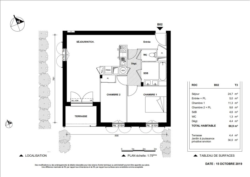 Nous vous proposons un agréable T3 Meublé situé en rez-de-jardin composé d'une entrée, d'un séjour avec cuisine équipée (évier inox, plaque 4 feux, hotte, meubles hauts et bas, réfrigérateur combiné, micro- onde, ustensile de cuisine....), de deux chambres dont une avec placard, d'une salle de bain aménagée, d'un WC séparé et d'une Terrasse de 4.4m² et d'un jardin de 34.00m². Il bénéficie de deux places de parking aérien.