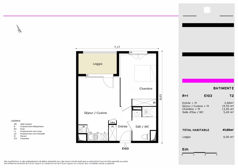 Il est composé d'une entrée, d'un séjour avec cuisine équipée (Meubles hauts et bas, un évier, plaque vitrocéramique 2 feux, une hotte, frigo top) s'ouvrant sur une loggia de 6m², d'une chambre avec placard, d'une salle d'eau aménagée avec WC.