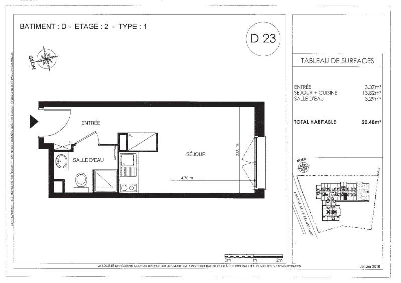 Découvrez ce studio situé au 2 éme étage de 20.48 m² , il se compose d'une entrée, d'une cuisine équipée (évier inox, plaque 2 feux, hotte, réfrigérateur table top, meubles hauts et bas), séjour, salle d'eau aménagée avec WC, placards aménagés, parking aérien et système de vidéophone.