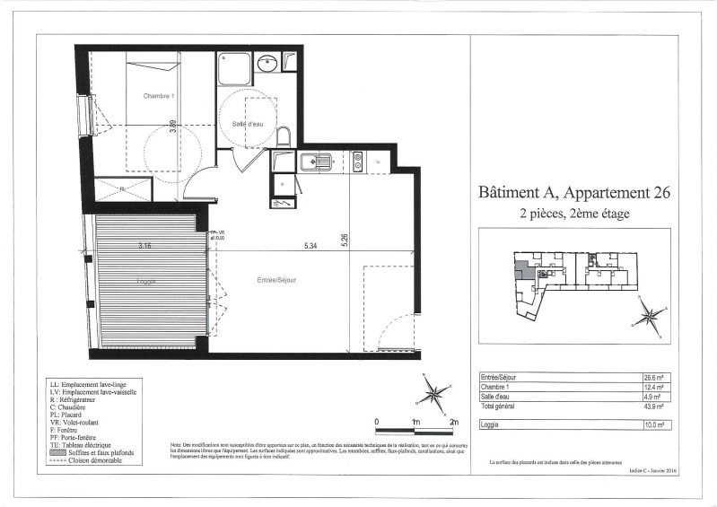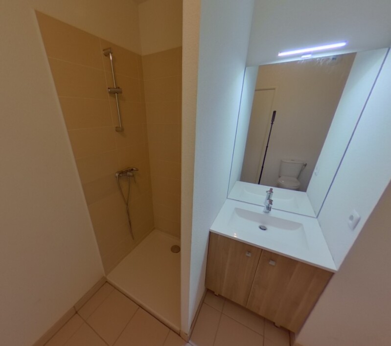 Cet appartement de type 2 est composé d'une entrée, séjour avec cuisine équipée (évier inox, plaque 2 feux, hotte, meubles hauts et bas, frigo top), d'une chambre avec placard, d'une salle d'eau aménagée.