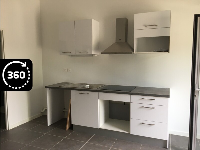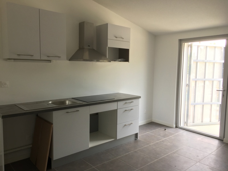 Un séjour lumineux avec cuisine équipée (évier inox, plaque 4 feux, hotte, meubles hauts et bas)
