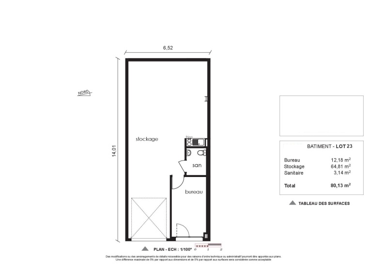 Le local d'une superficie de 80.13 m² dispose d'un bureau climatisé avec vitrine de 12.18m² équipé de prise RG45 , d'un espace de stockage de 64.81 m² avec porte sectionnelle motorisé et d'un espace sanitaire.
