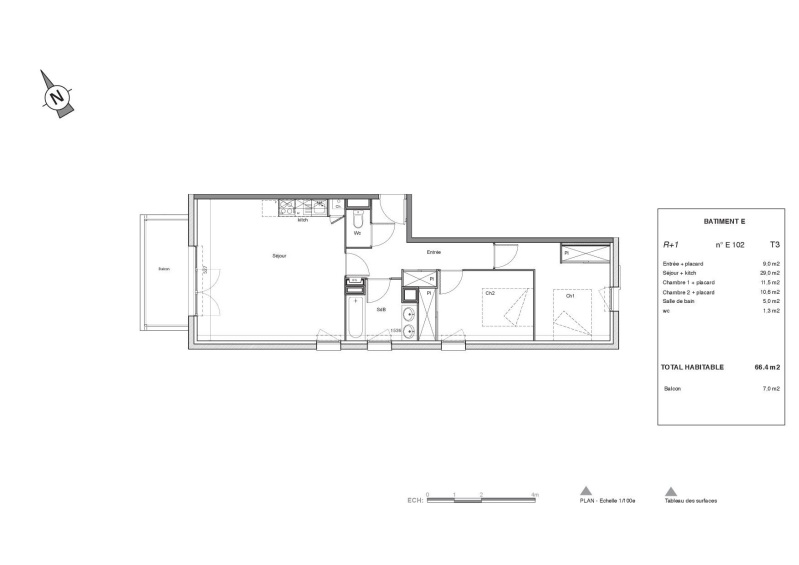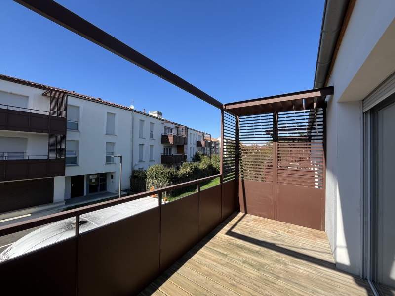 Il est composé d'une entrée, d'un séjour avec cuisine équipée (évier inox, plaque 4 feux, hotte, meubles hauts et bas), de deux chambres dont une avec placard, d'une salle de bain aménagée, d'un WC séparé et d'un balcon de 7m². Il bénéficie de deux places de parking en sous-sol et d'une place sous-abri.