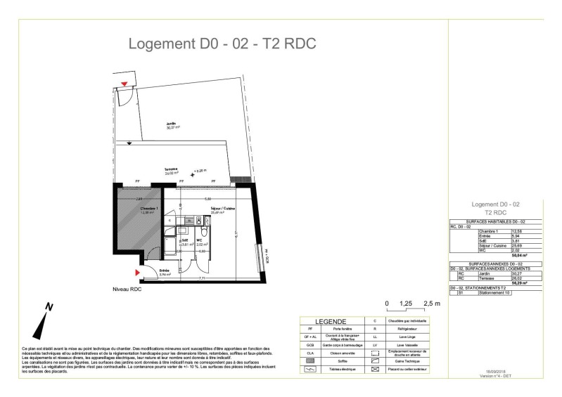 Il se compose d'une entrée, d'une cuisine équipée (évier inox, plaque 2 feux, hotte, meubles hauts et bas, frigo top)ouvert sur le séjour avec accès sur une belle terrasse de 26.02m² avec jardin 30.27m², d'une chambre, d'une salle d'eau aménagée et d'un WC séparé.