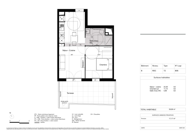 Il est composé d'un séjour avec cuisine équipée (meubles haut et bas, hotte, évier inox, plaque vitrocéramique 2 feux, réfrigérateur table top), d'une chambre avec placard, d'une salle d'eau aménagée avec WC et d'une terrasse de 17.17m². Il bénéficie d'une place de parking en sous sol.