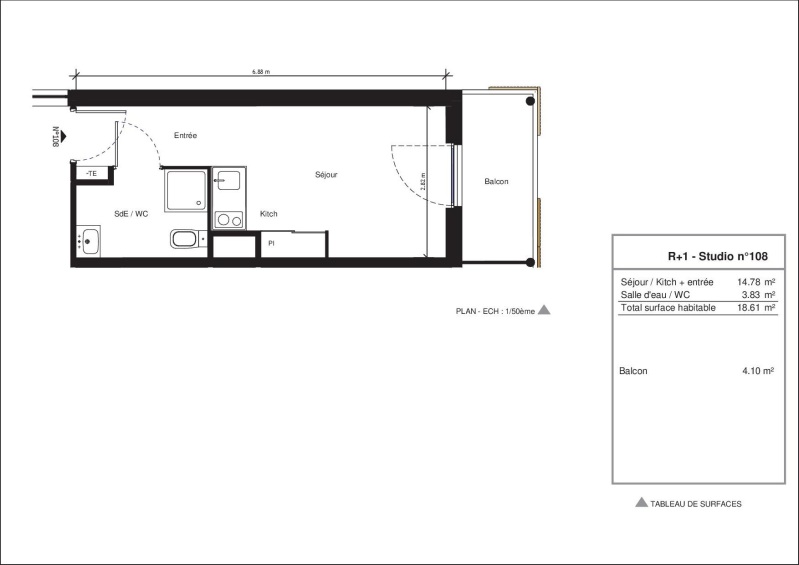 Il est composé d'une entrée, d'une pièce de vie avec cuisine équipée (évier inox, plaque 2 feux, hotte, meubles hauts et bas,frigo table top,), d'une salle d'eau aménagée avec WC, d'un balcon de 4.10m².