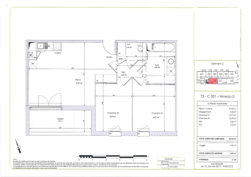 Agréable T3 composé d'une entrée, séjour avec cuisine équipée (évier inox, plaque 4 feux, hotte, meubles hauts et bas, réfrigérateur-congélateur), de deux chambres avec placard, d'une salle de bains aménagée et d'un coin WC séparé, une loggia de 7.40m² , un parking sous-sol.