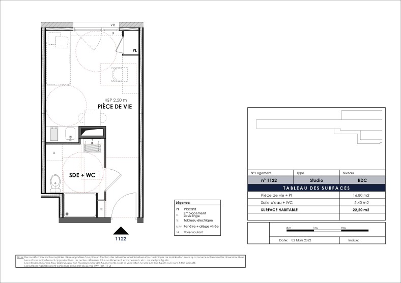 Le studio de 22.20m² offre une pièce de vie fonctionnelle avec une cuisine équipée, un réfrigérateur table top et des rangements pratiques. La salle d'eau moderne avec WC vous garantit un confort simple et efficace au quotidien.