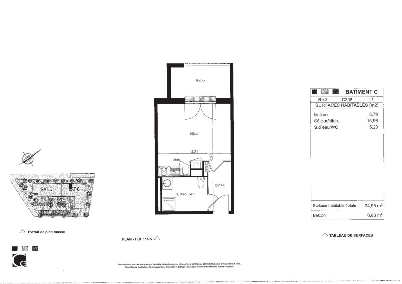 Situé au 2 ème étage d'une résidence, appartement Studio de 24,95m² comprenant une entrée avec placard, une cuisine équipée (meubles hauts et bas, plaque vitrocéramique 2 feux, hotte aspirante, réfrigérateur table top) ouverte sur le séjour et donnant sur un balcon de 6,86m², salle d'eau avec WC, une place de parking.