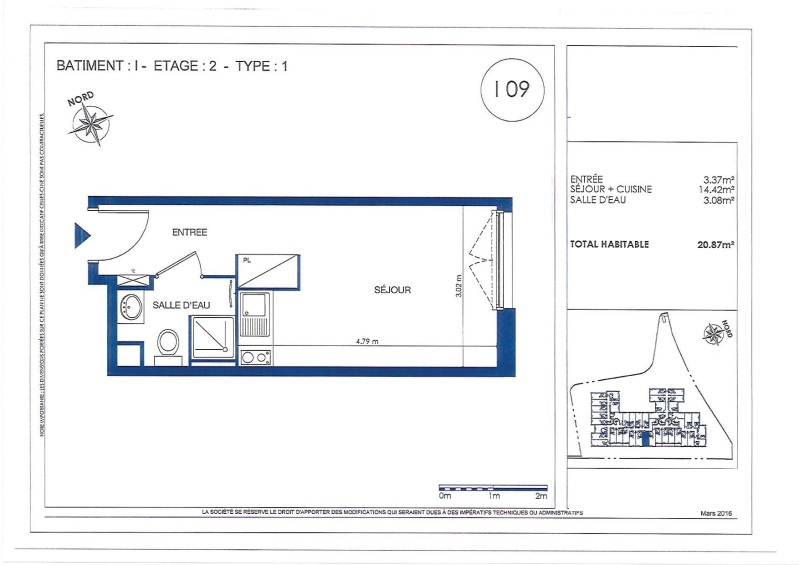 Découvrez et réservez votre studio, avec entrée, cuisine équipée (évier inox, plaque 2 feux, hotte, réfrigérateur table top, meubles hauts et bas), séjour, salle d'eau aménagée avec WC, placards aménagés, parking aérien et système de vidéophone.