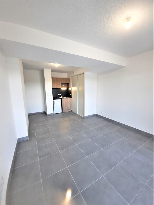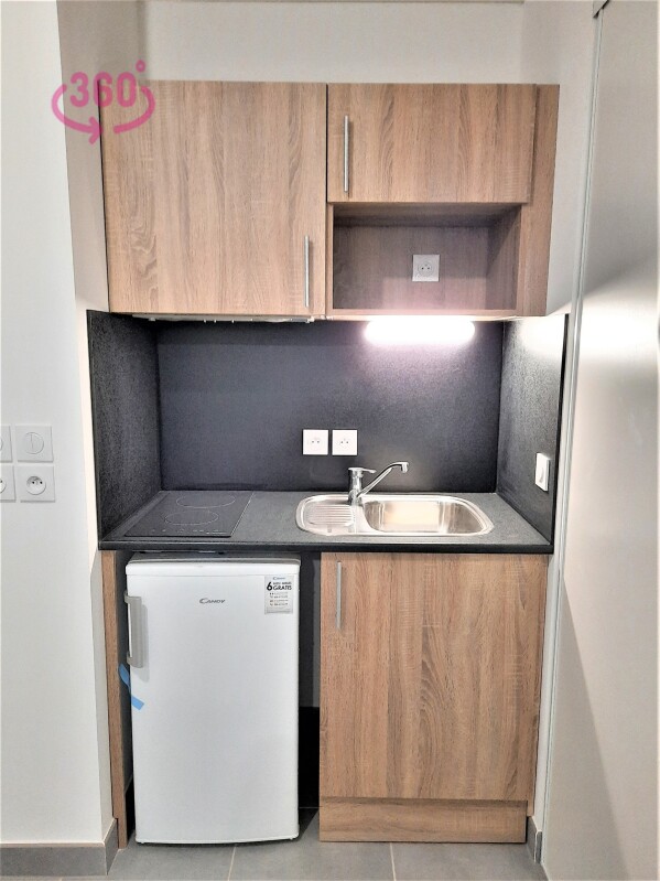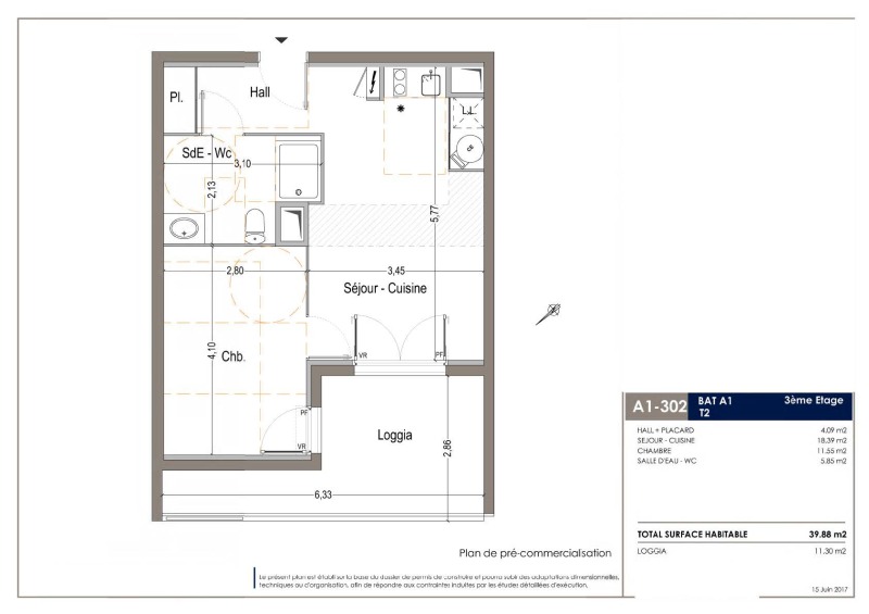 Il est composé d'une entrée, d'un séjour avec cuisine équipée (évier inox, plaque 2 feux, hotte, meubles hauts et bas, frigo top), d'une chambre, d'une salle d'eau aménagée avec WC, d'un loggia de 11.30m². Il bénéficie d'un parking sous-sol.
