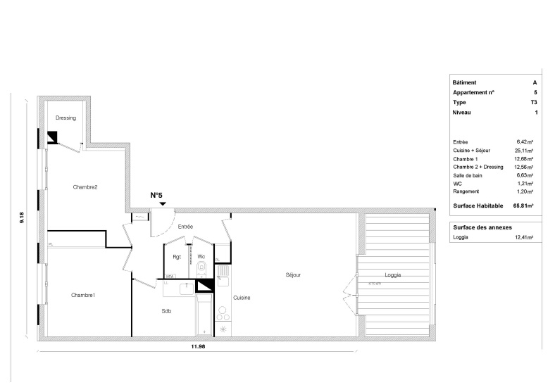 L'appartement s'ouvre sur une entrée menant à un séjour lumineux avec coin cuisine , prolongé par une spacieuse loggia de 12.41m², idéale pour profiter d'un véritable espace de vie supplémentaire.