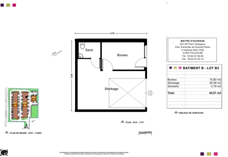 Le local d'une superficie de 40.57m² dispose d'un bureau climatisé avec vitrine et porte piétonne de 10.80m², d'un espace de stockage avec porte sectionnelle motorisé de 26.58m² et d'un espace sanitaire.